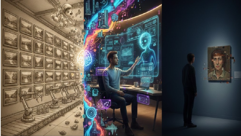 이 과정에서 창작자들은 자신의 작업물이 AI의 학습 데이터로 소비되는 자기 잠식 현상을 겪으며 생존의 위협을 느낀다. 그러나 본질적인 차이는 존재한다. 인간의 창작이 영감과 의도에서 출발한다면, AI의 생성은 확률과 통계에 기반한다. AI는 결과물의 아름다움이나 도덕성을 스스로 판단하지 못하며, 단지 데이터 분포에 부합하는 답을 내놓는 정교한 조립공일 뿐이다. 결국 AI가 출력한 결과물에 서사를 입히고 최종적인 가치를 완성하는 ‘큐레이팅’과 ‘편집’은 오롯이 인간의 몫이다.