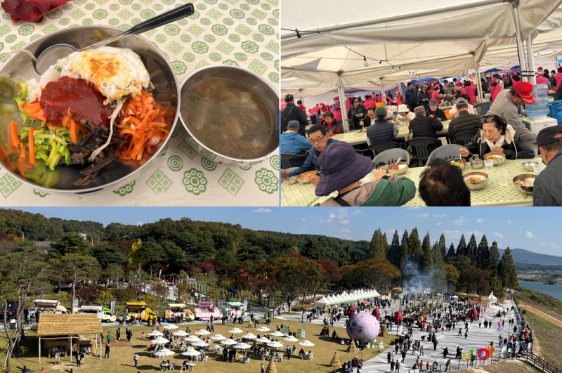 여주쌀 가마솥 비빔밥을 먹었습니다. 15개의 대형 가마솥으로 지은 여주쌀밥인데 장작으로 지은 밥 그리고 장작으로 구운 고구마까지 입맛을 돋우네요.
